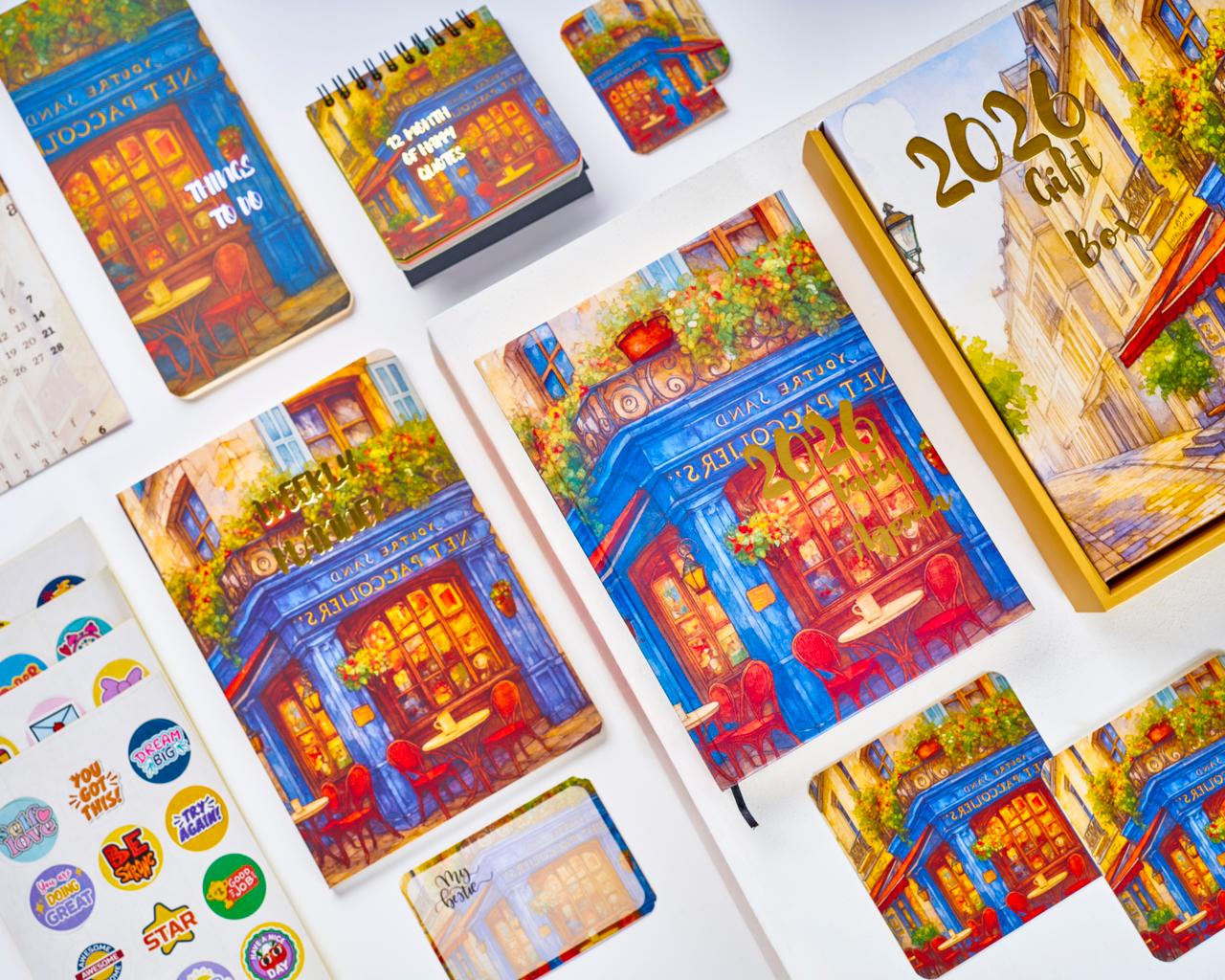 Inside the box you’ll find: a daily planner, weekly planner (52 sheets), mini inspiration stand (12 quotes), to-do list, stickers, bookmark, 2026 calendar, and 2 premium coasters — all available in 6 unique designs.